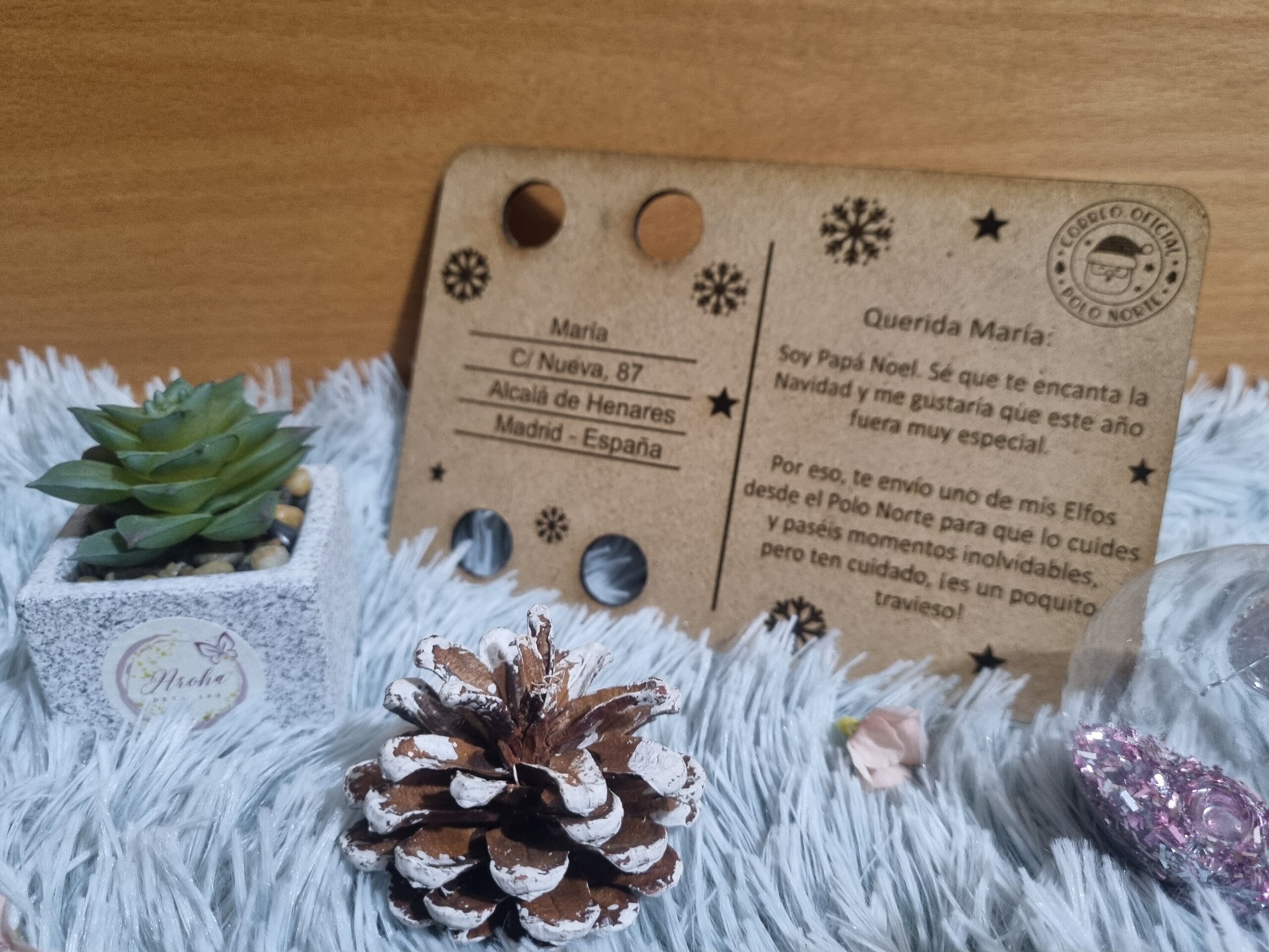 Prepara la llegada del elfo navideño con esta mágica Postal de Madera para la llegada del Elfo Travieso, un mensaje directo de Papá Noel personalizado con el nombre de tu pequeño o pequeños. Perfecta para sorprenderles el 1 de diciembre, esta postal es el anuncio oficial de que un elfo